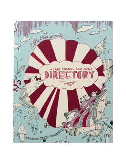 Published by Little Otsu, Lart Cognac Berliner, and Jill Bliss. Illustrations by Lart and designed by Jill. Printed with soy-based ink on tree-free kenaf and recycled papers at printshop in Portland, OR. Five color-coded lettered sections (A-E, F-J, K-O, P-T, and U-Z) with entries for name, address, phone, mobile, e-mail, and birthday.